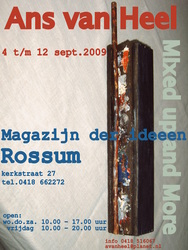 Mixed up and More Ans van Heel De in Rossum geboren Ans van Heel, exposeert in Het Magazijn der Ideeen haar werk. De locatie en de werken smelten samen tot één geheel. De expositie draagt de titel: Mixed up and More, vanwege de diversiteit in materiaal en samenstelling van de werken. De vormgeving, fotografie en afwerking van het affiche is gemaakt door Ans. Expositie is van 4 t/m 12 sept. 2009