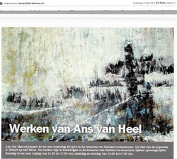 maandag 3 September - zaterdag 6 Oktober 2012 Expositie Ans van Heel 'Mixed up and More' Galerie foyer theater de Poorterij Zaltbommel info 418516067 Ans van Heel haalt haar inspiratie uit alledaagse gebeurtenissen, bronnen zijn niet direct te benoemen. Haar werk is te lezen als visueel verslag in vrije beeldtaal. Ze werkt met verschillende materialen, schoonheid van verval en/of oorspronkelijkheid zijn in het hele proces belangrijk. De manier van werken is niet eenduidig uit te leggen. http://www.poorterij.nl